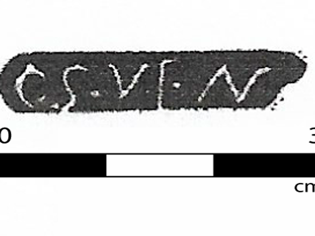 Cuenco de la forma hisp.27. Base con pie anular de sección rectangular (diámetro base 3,5 cms.). en el fondo interno cartela rectangular de extremos bífidos (2,2 x 0,4 cms.)